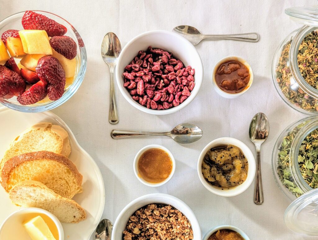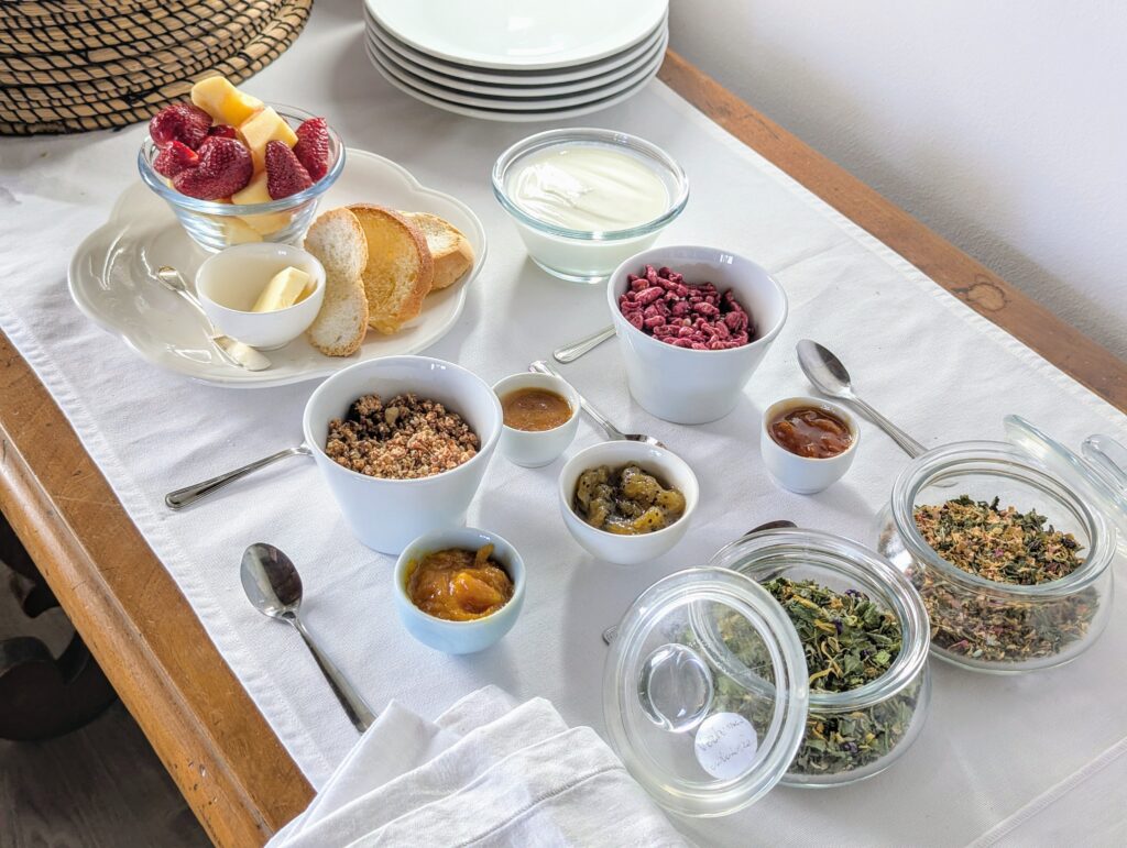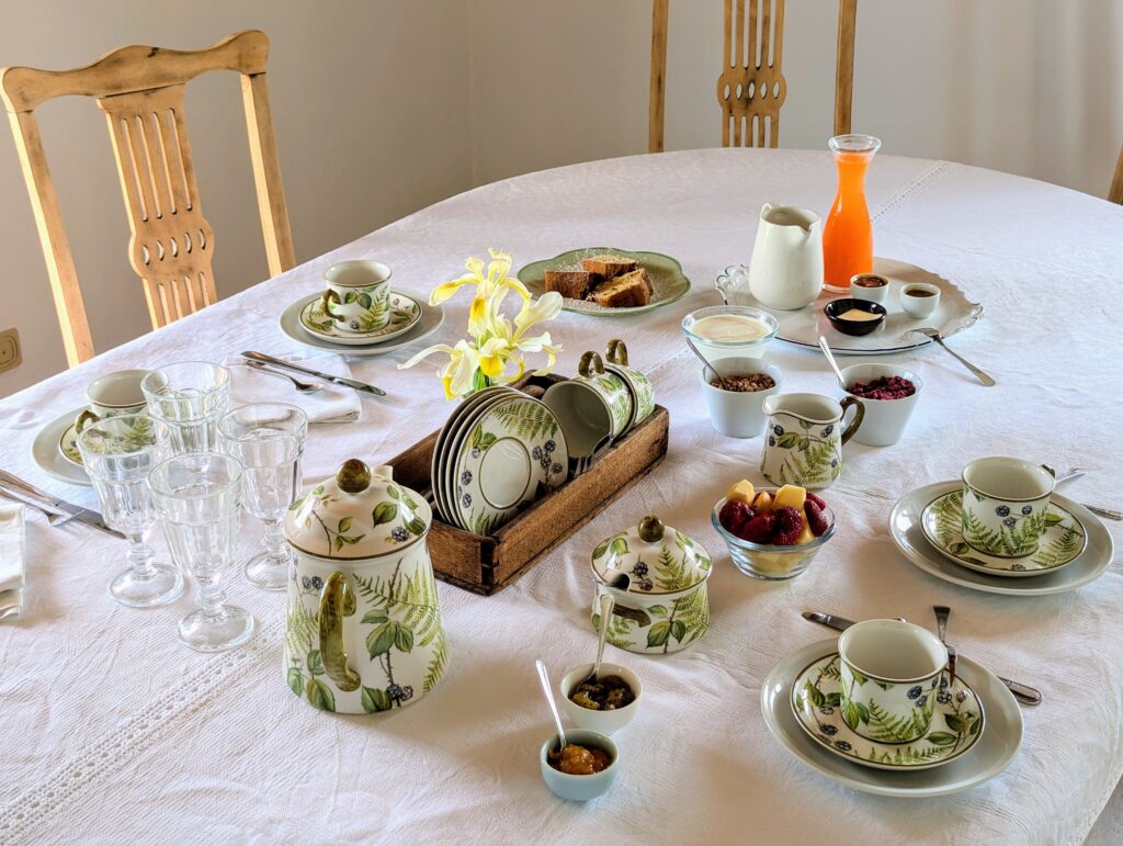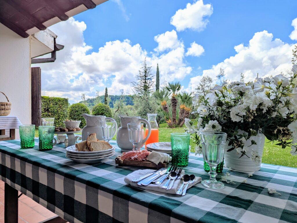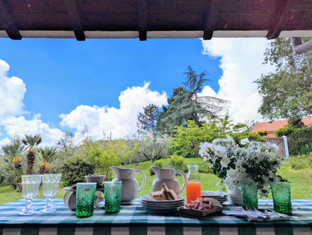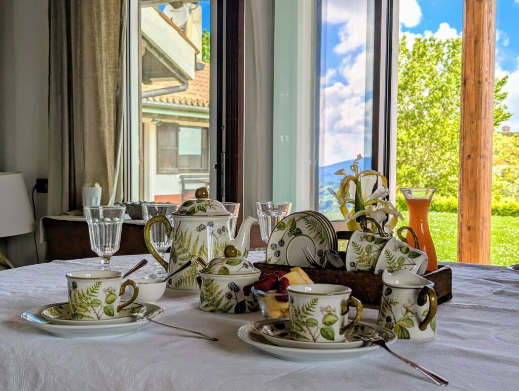 Quando il tempo lo consente, durante la bella stagione praticamente sempre, la colazione viene servita sotto al portico. Caffè o tè sono accompagnati da pane fresco, biscotti, marmellate torte e crostate fatte in casa, per chi preferisce il salato, non mancano salumi e formaggi della zona.